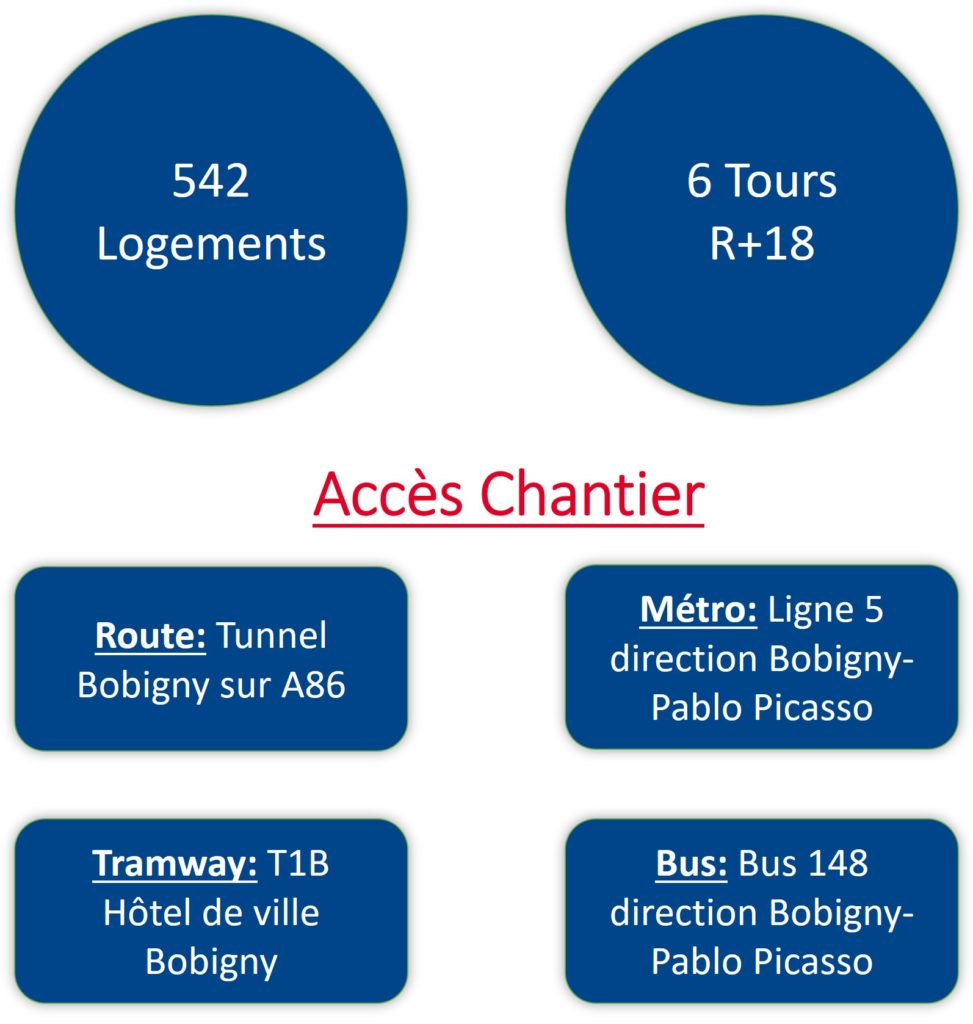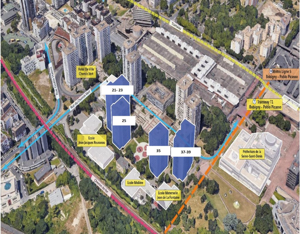 L’opération a pour objectif la réhabilitation de 542 logements, répartis sur 6 tours de 18 étages situées au 21-23, 25, 35, 37-39 rue du chemin vert, 93000 BOBIGNY.